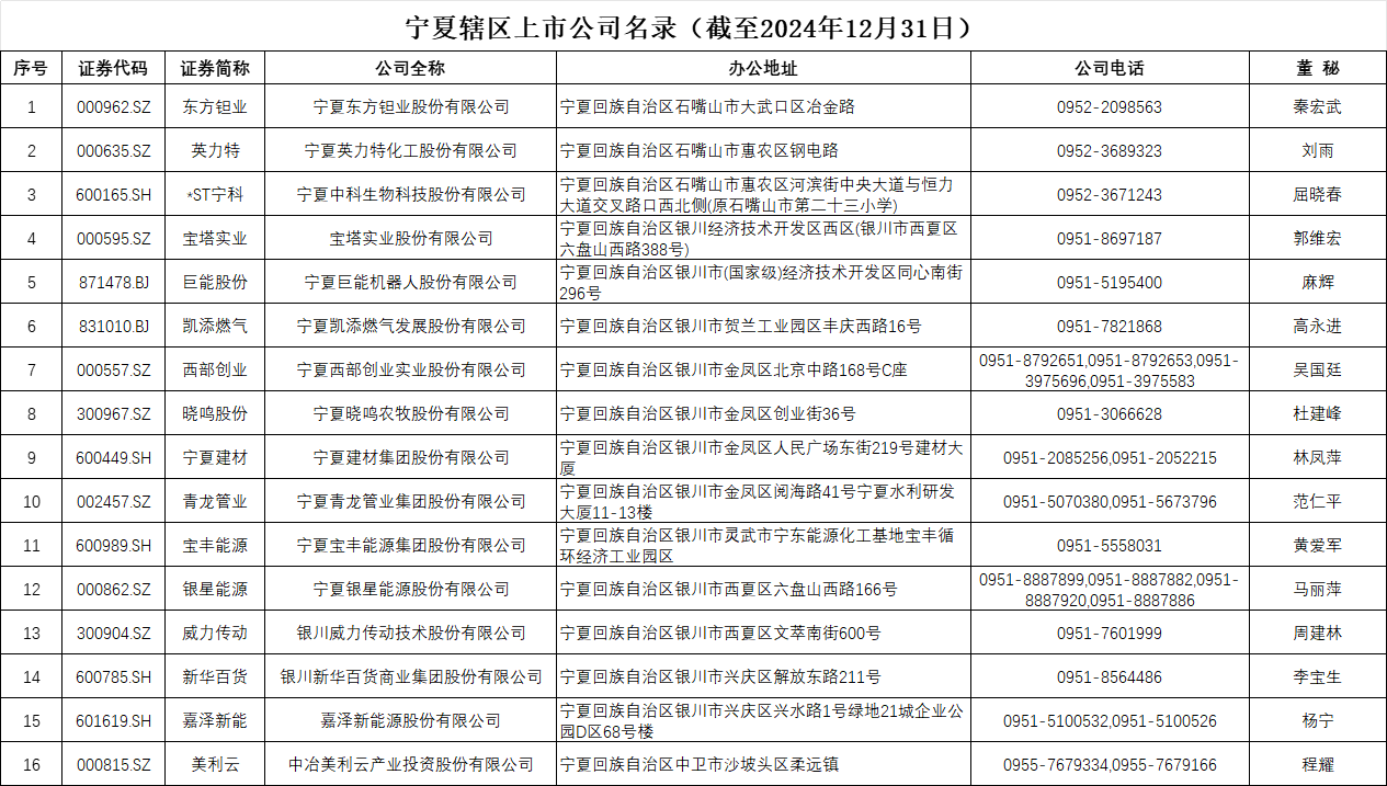 宁夏辖区上市公司名录(截至2024年12月31日)