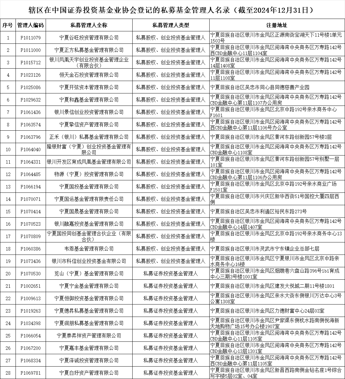 宁夏辖区私募基金管理人名录(截至2024年12月31日)